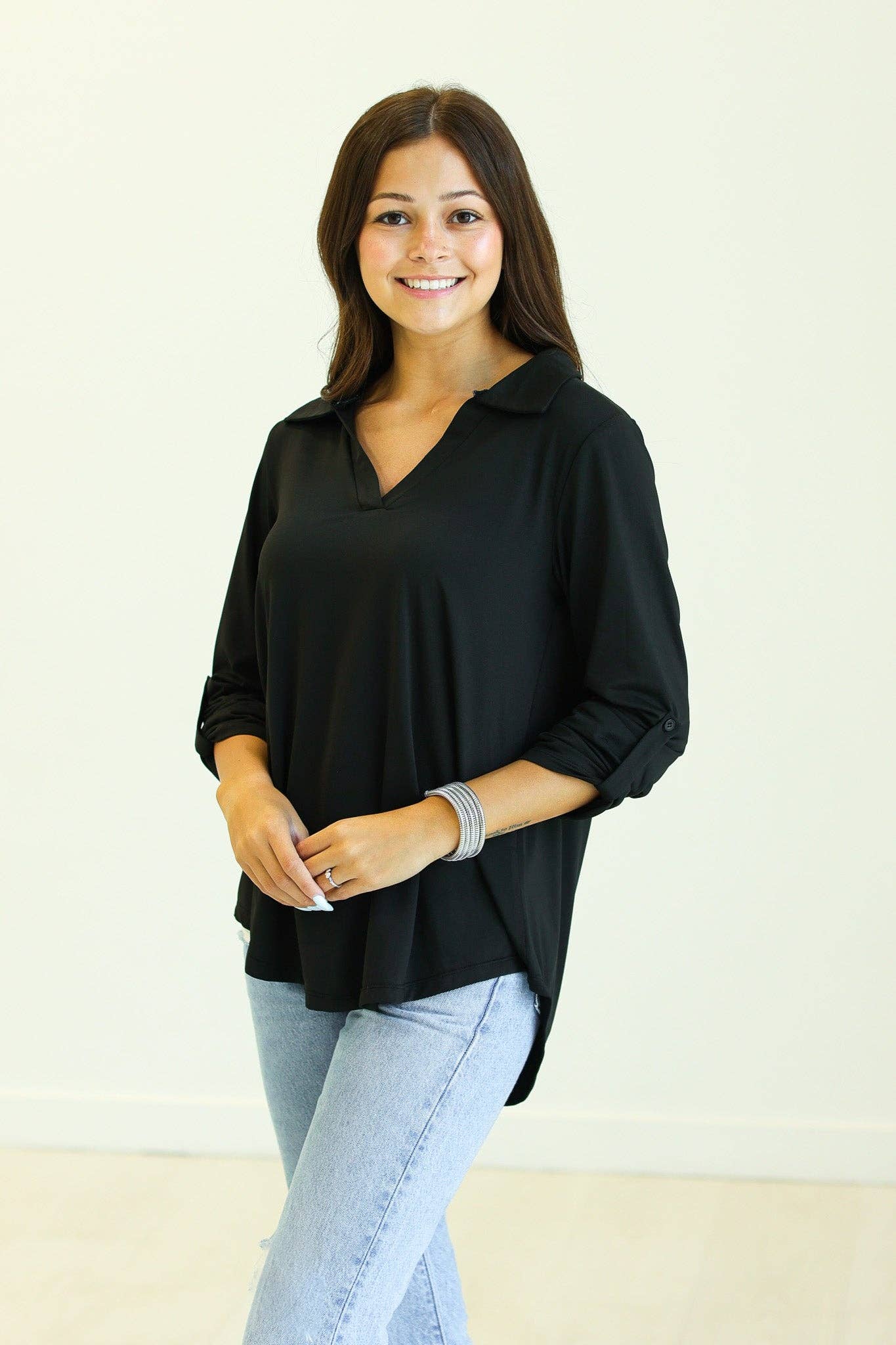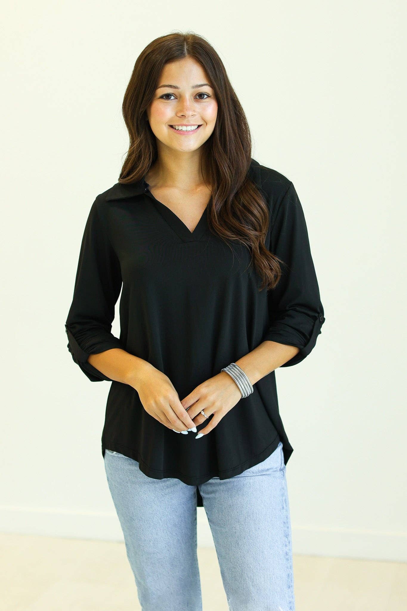 This versatile and stylish top features a relaxed fit for ultimate comfort. Designed with high stretch for flexibility, we recommend sizing down for a snugger fit. The V-neckline adds a flattering touch, while the adjustable sleeves offer functionality—wear them long or roll them up using the convenient button near the elbow for a customized look. Perfect for everyday wear with a polished twist.